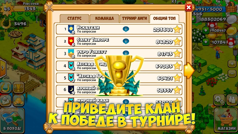 - ⚔️ Клановые турниры — сражайтесь с другими кланами за золото и почёт. Вместе побеждать легче!